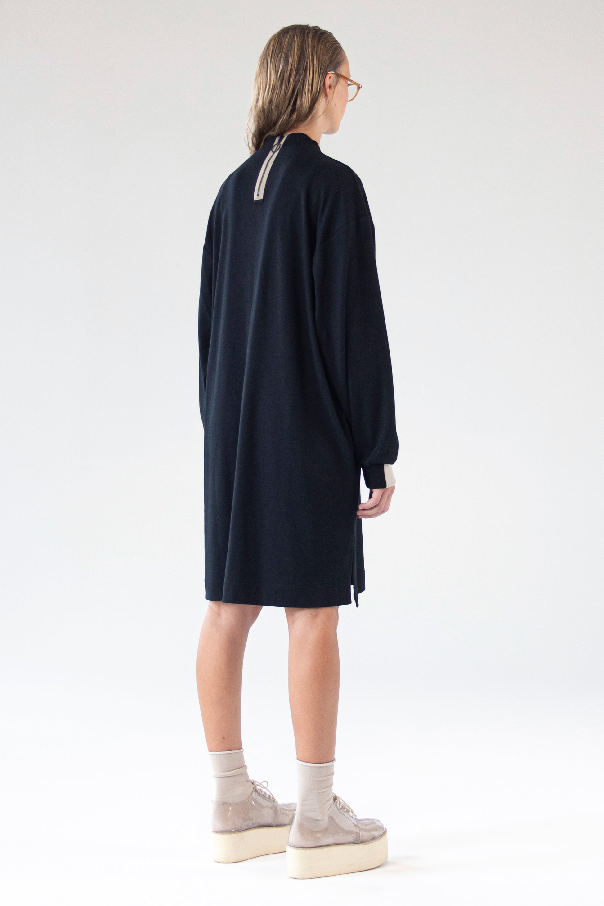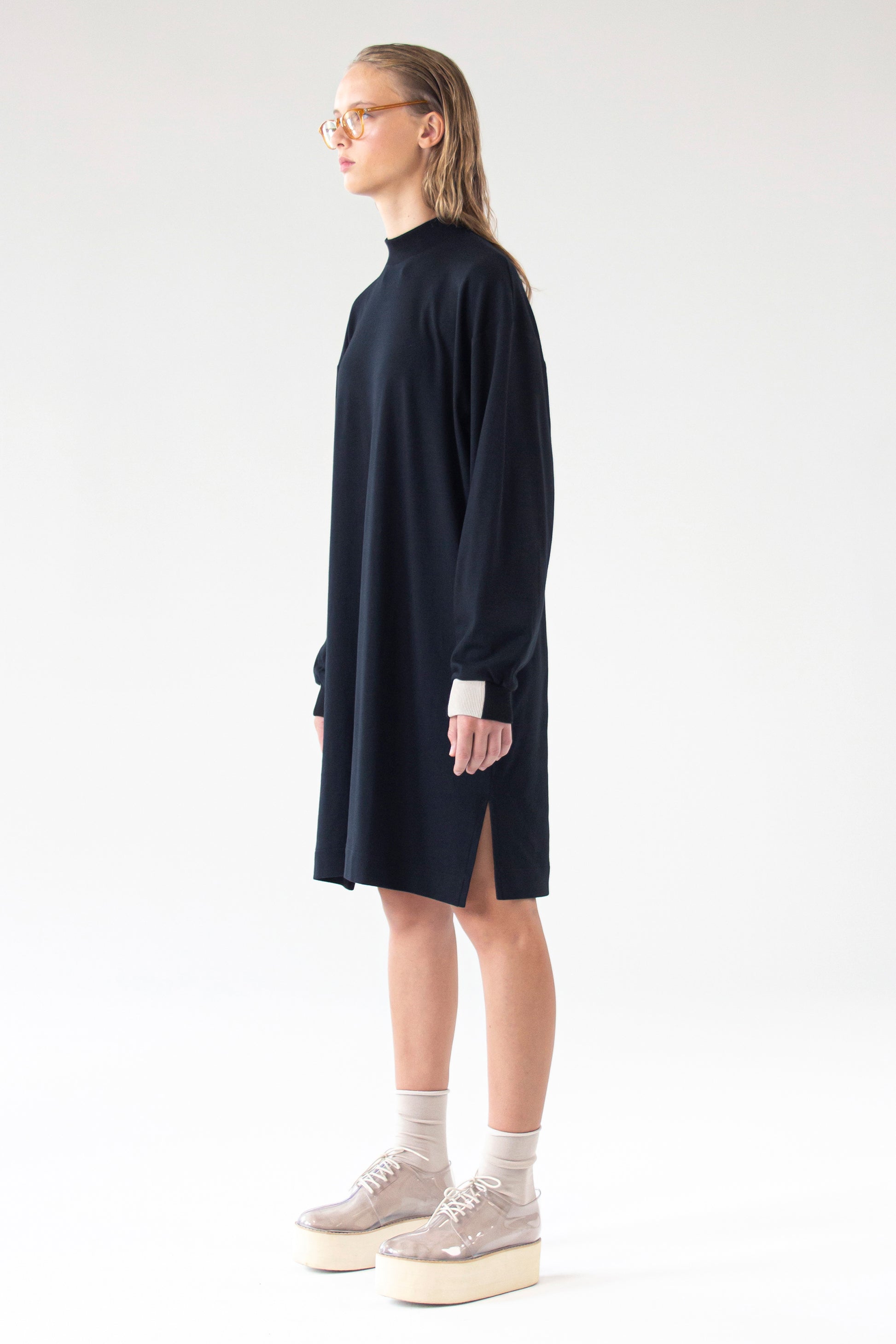 Loose-fit black jersey dress with a stand-up collar, contrast beige detail on both cuffs and small slits on both sides. The dress has a beige zip fastening at the back. The dress is made of 100% cotton - certified high quality cotton knitted fabric. The design and production of the dress are made in Latvia.