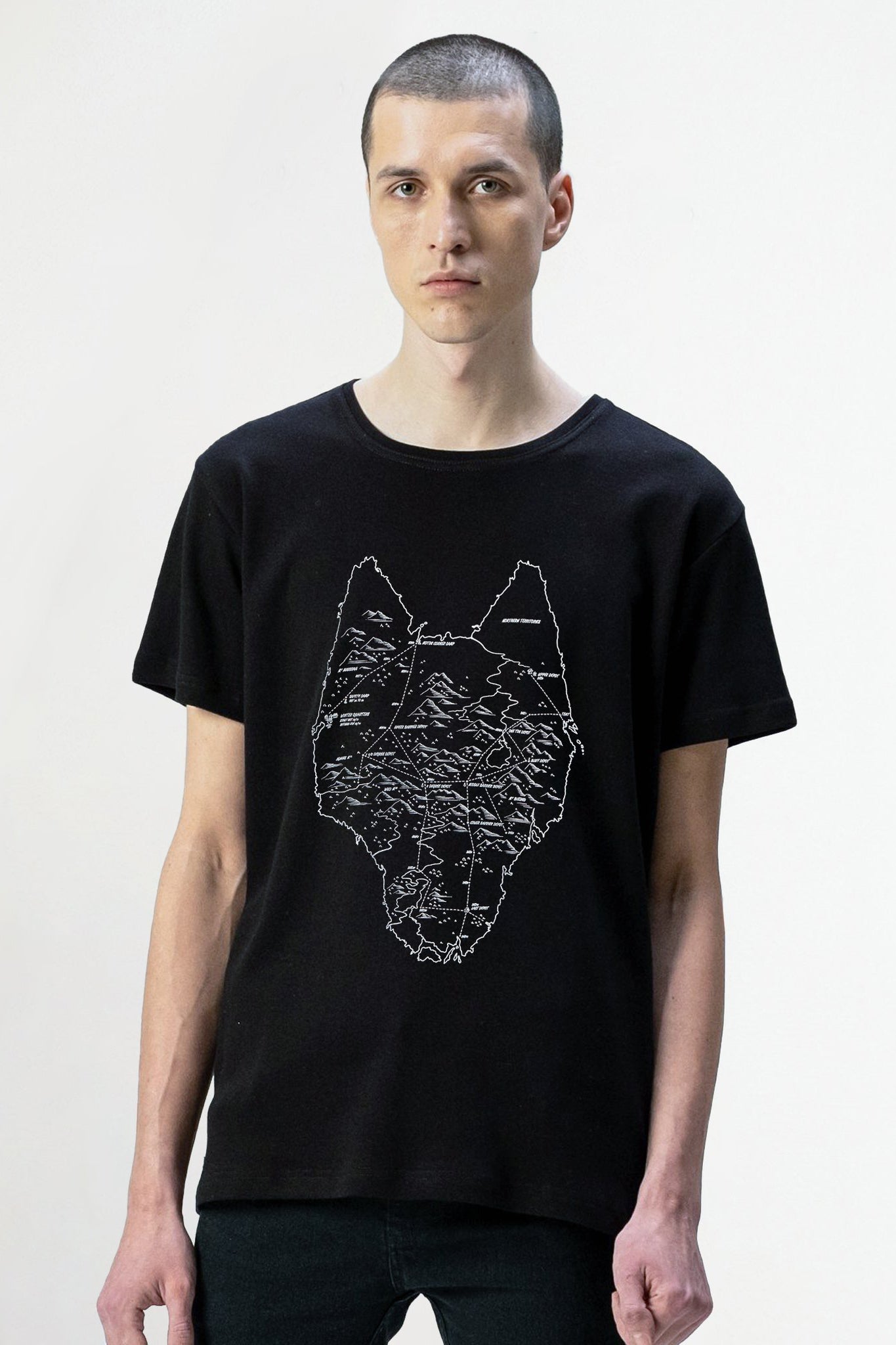 Experience the softness and comfort of pure cotton with our classic unisex T-shirt. The unique white silk-screen print of a One Wolf map adds a touch of individuality and style to your wardrobe. Embrace the wild and embrace your unique self with this black T-shirt.