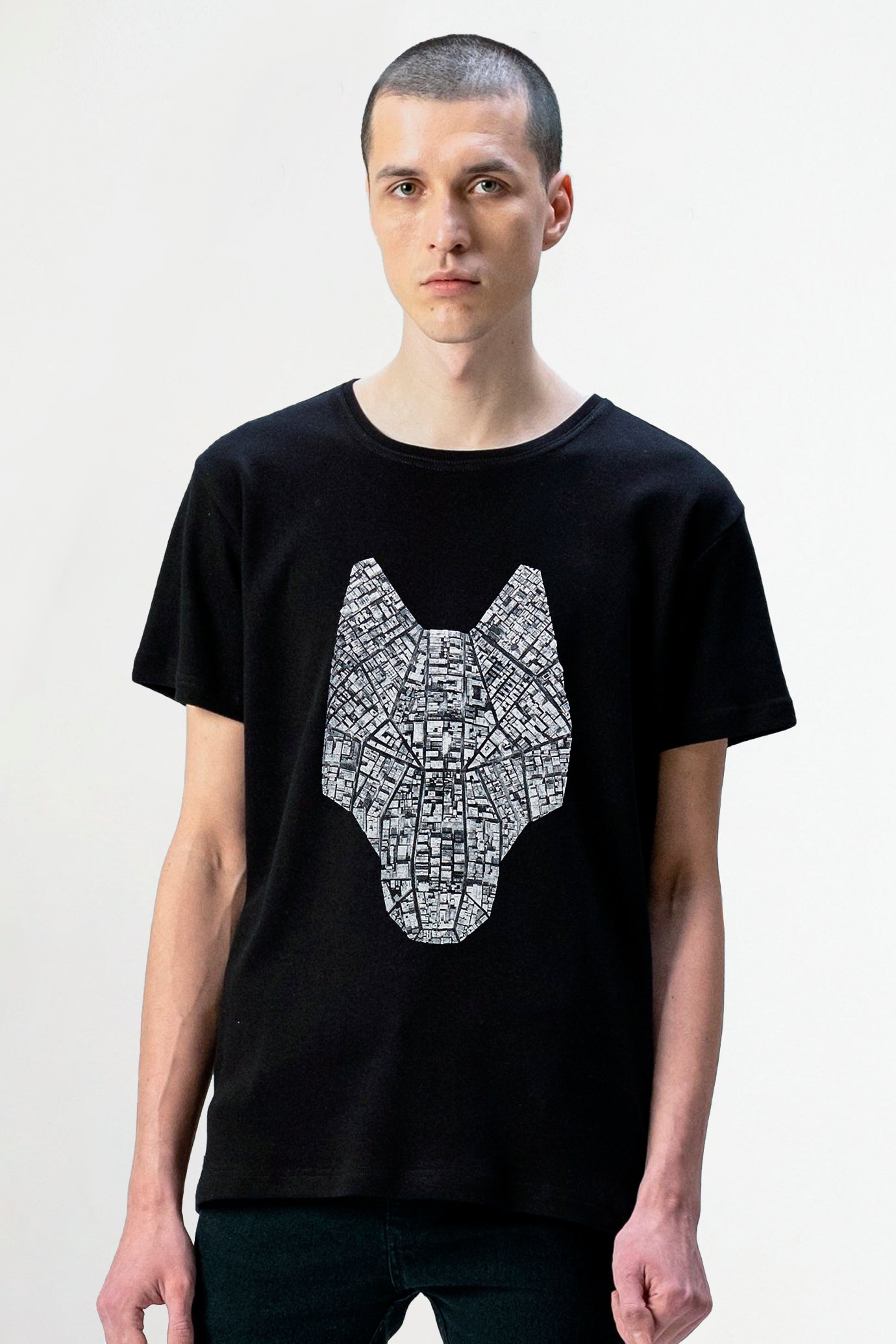 Black, classic unisex T-shirt, made from 100% cotton fabric, with slightly cuffed sleeves. A unique white silk-screen print of a One Wolf map view on front.