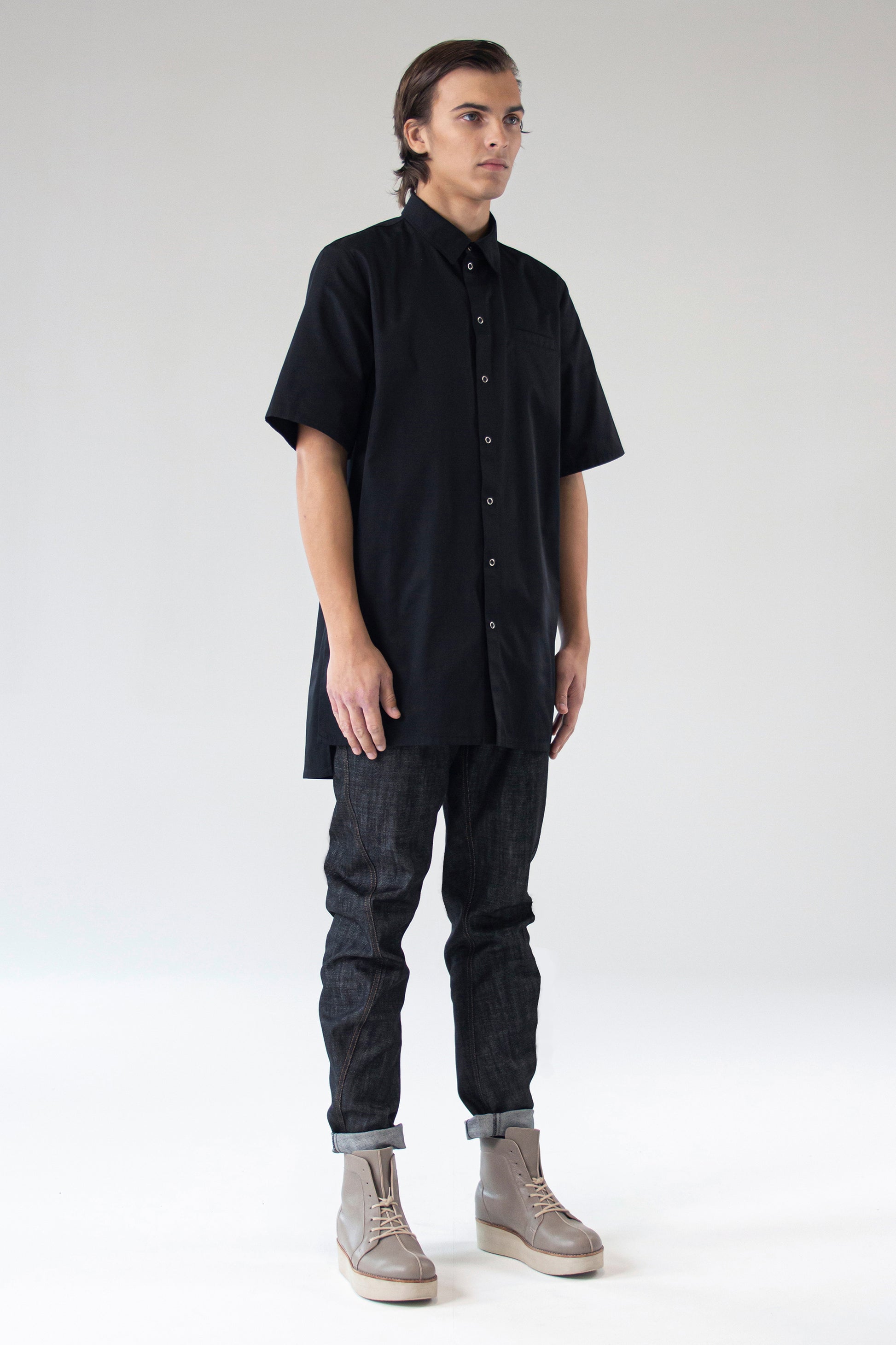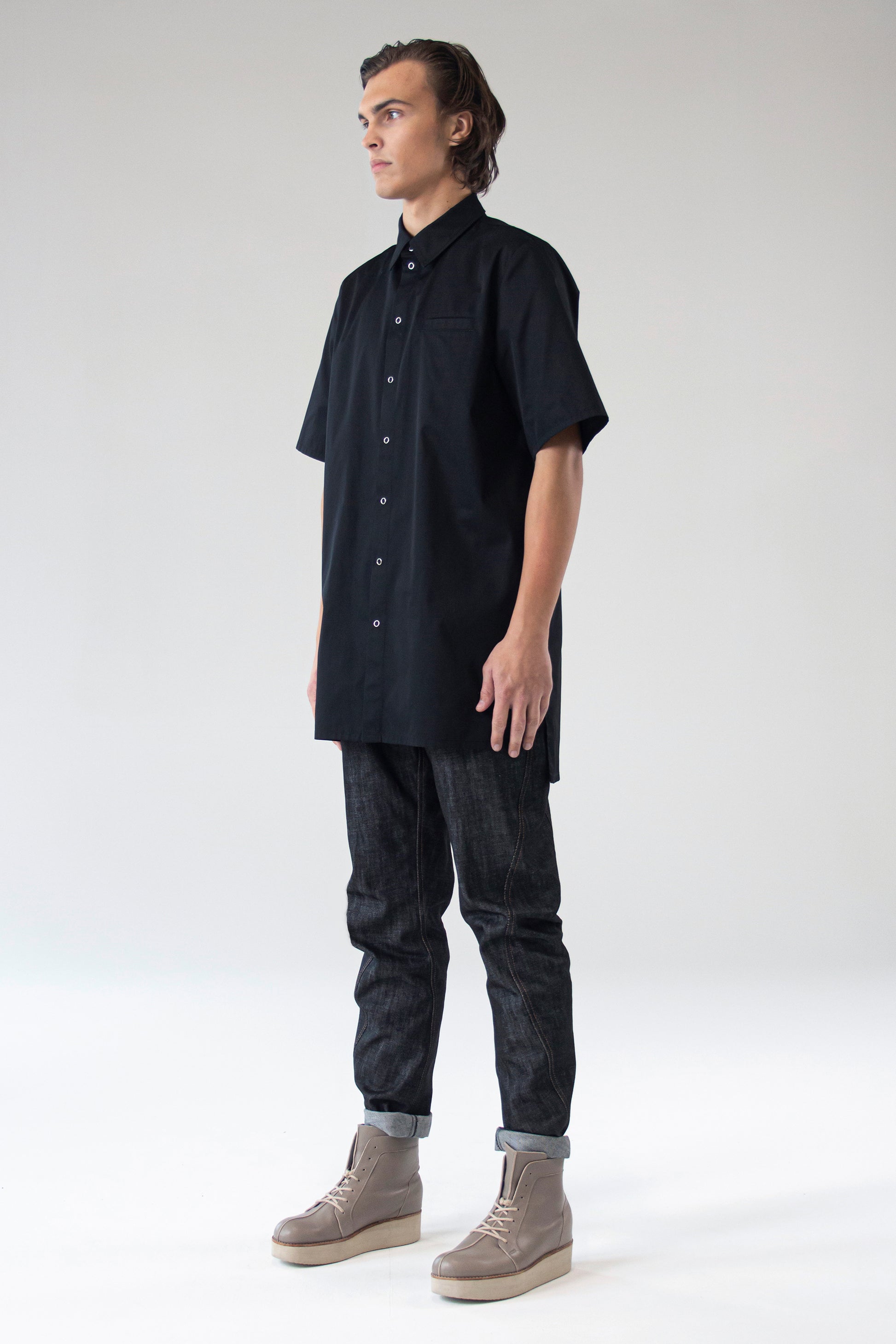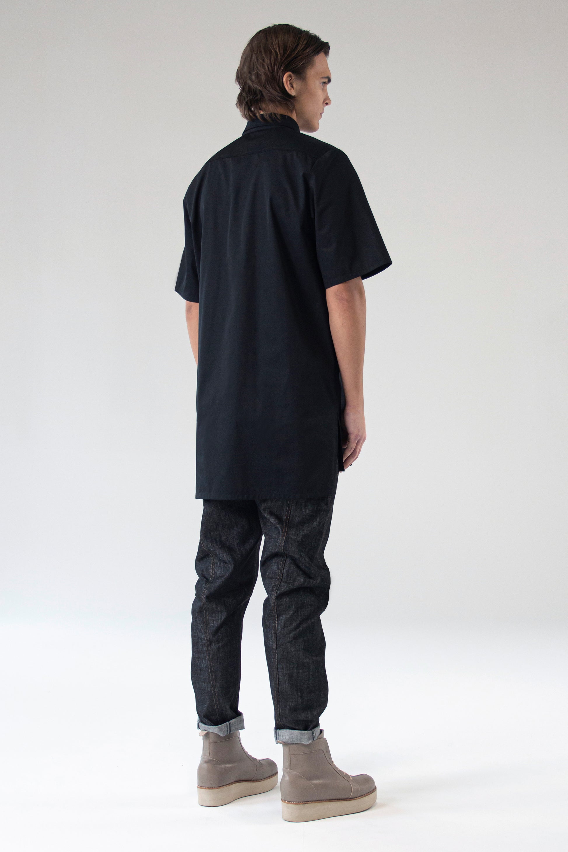 Loose fit, extended black unisex shirt with classic collar and button fastening. Made of practical 100% cotton material. Design and production in Latvia.