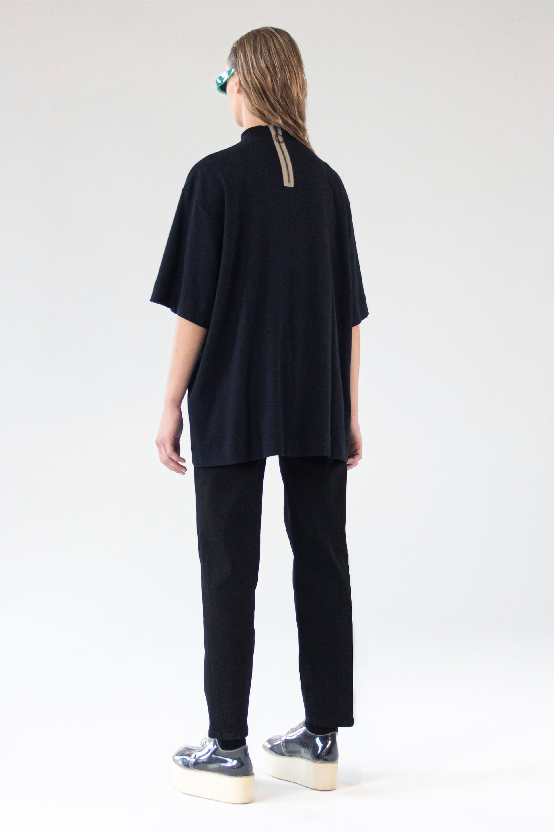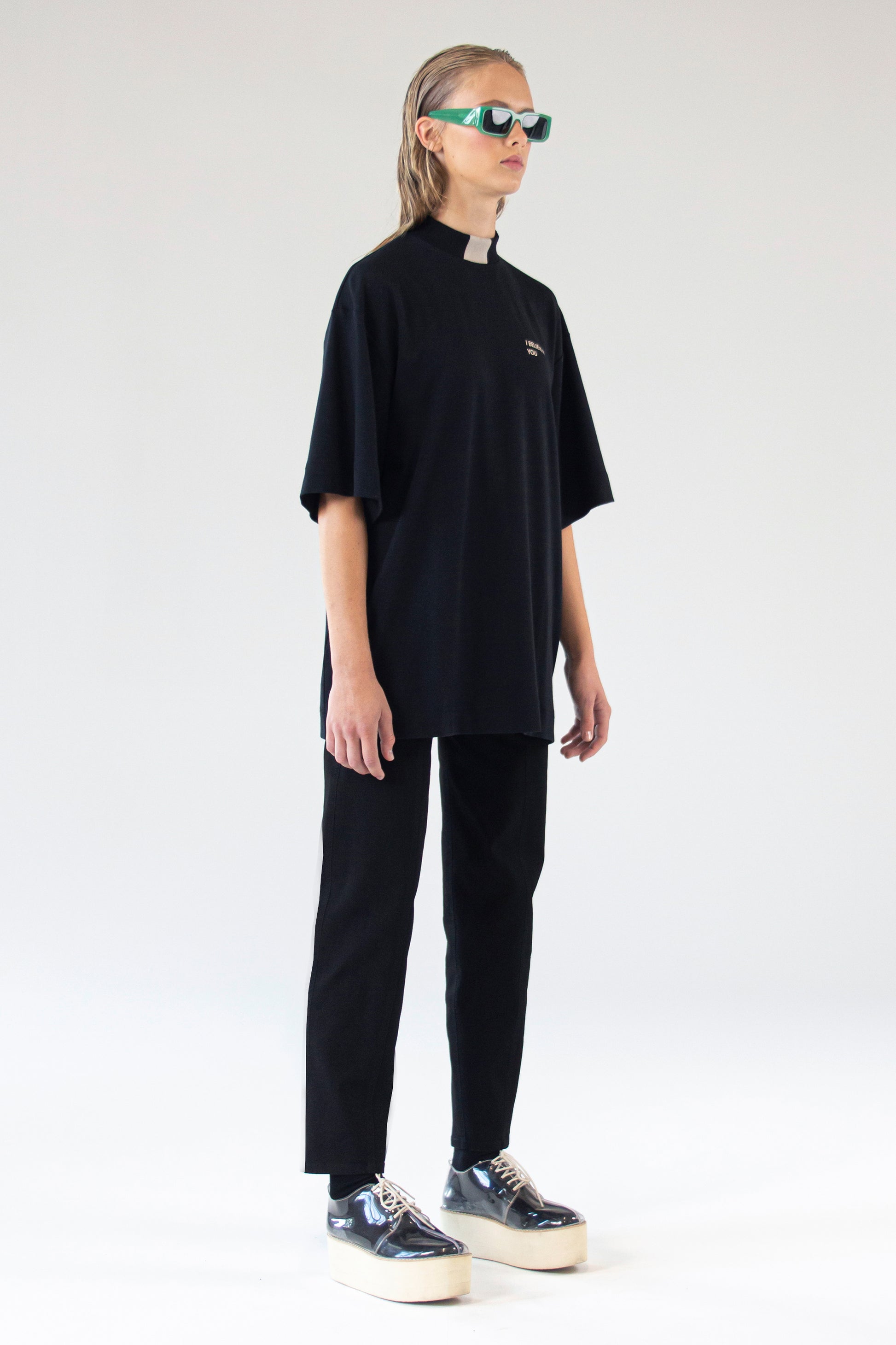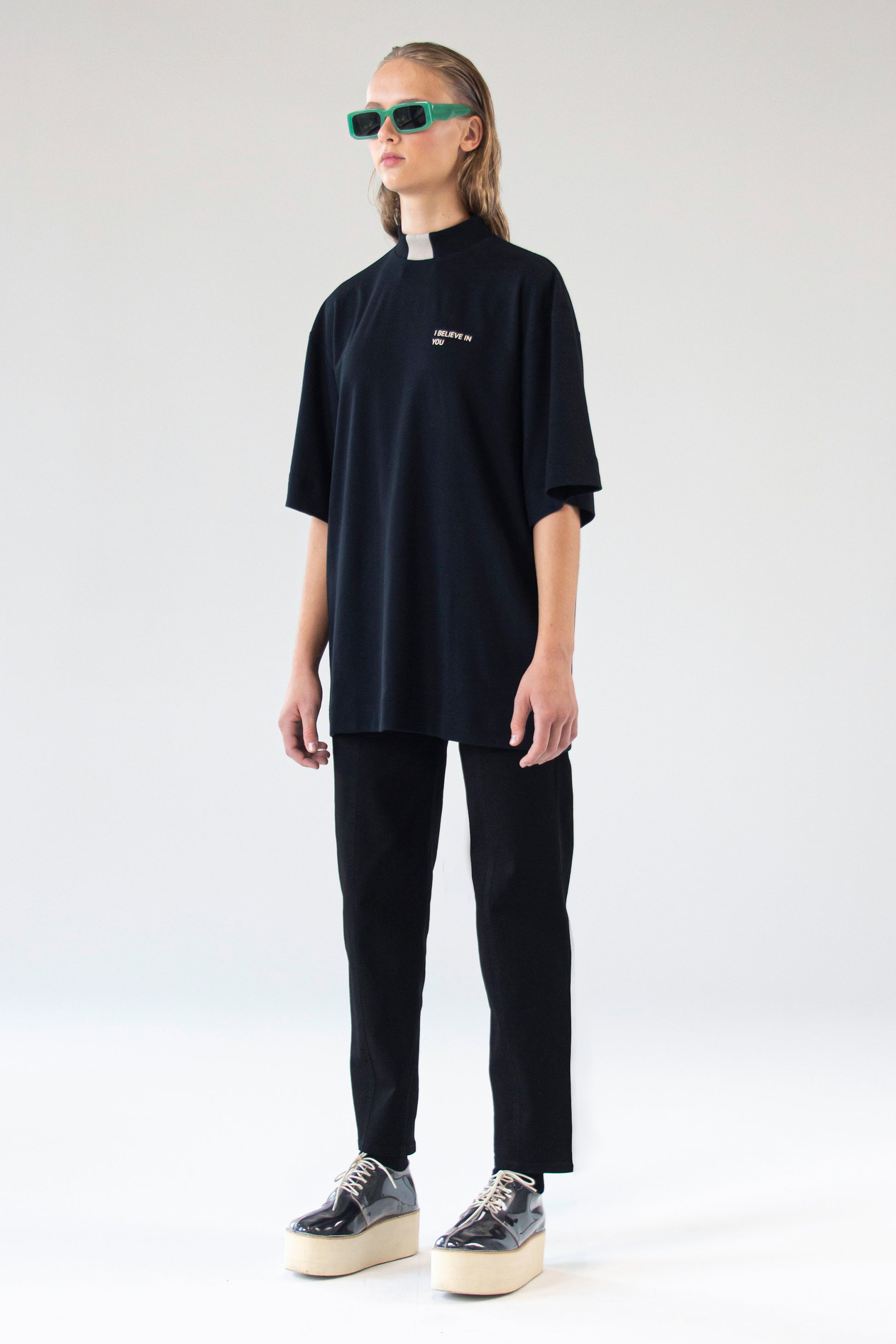 Loose fit, extended black jersey T-shirt with I BELIEVE IN YOU print on the front, stand-up collar with contrast beige detail on the front and zip at the back. Made from 100% certified high quality cotton.