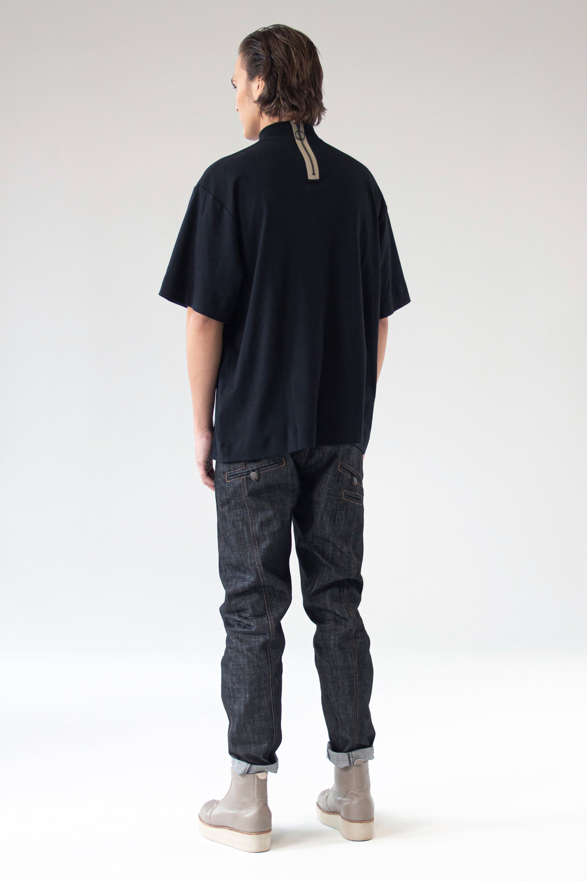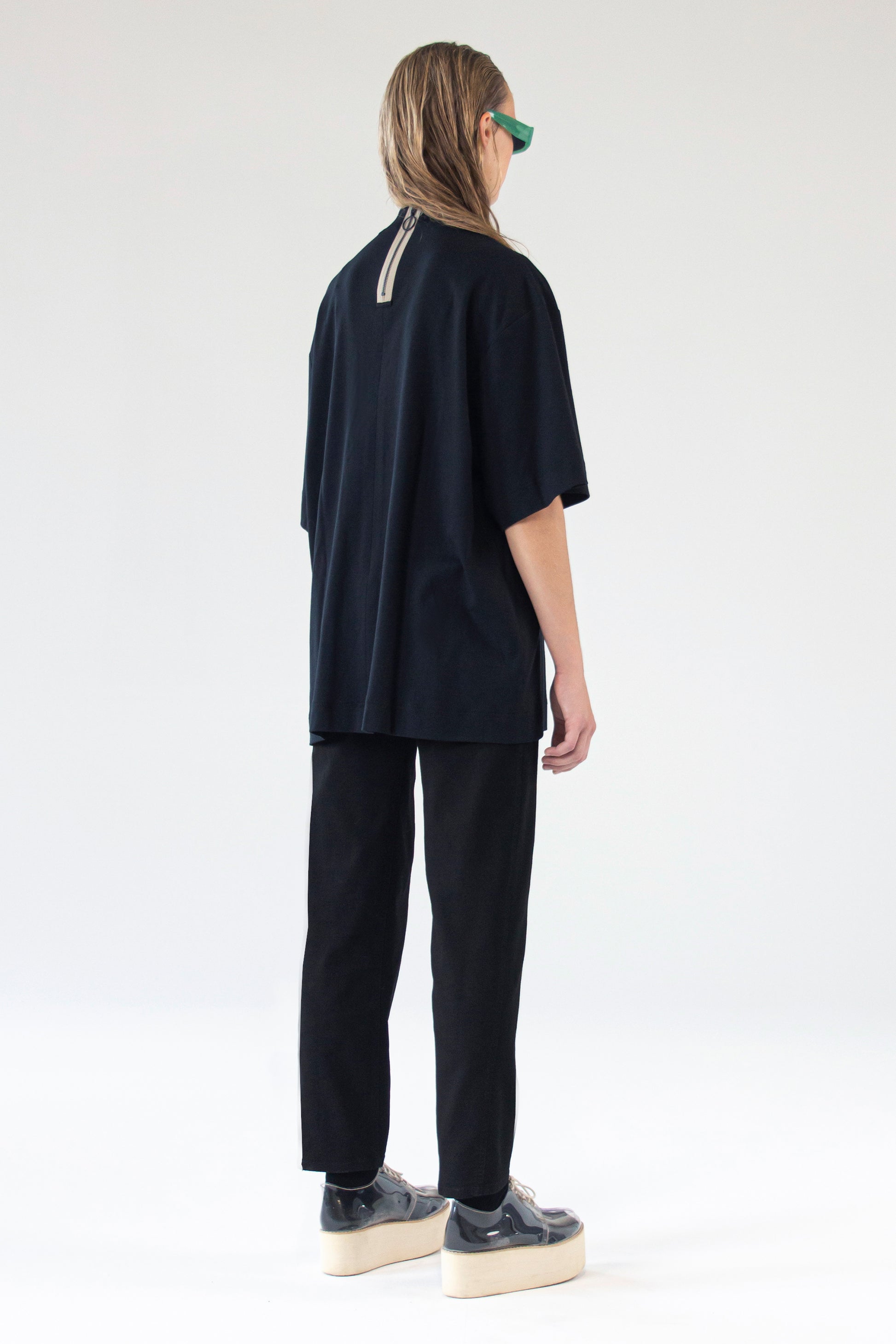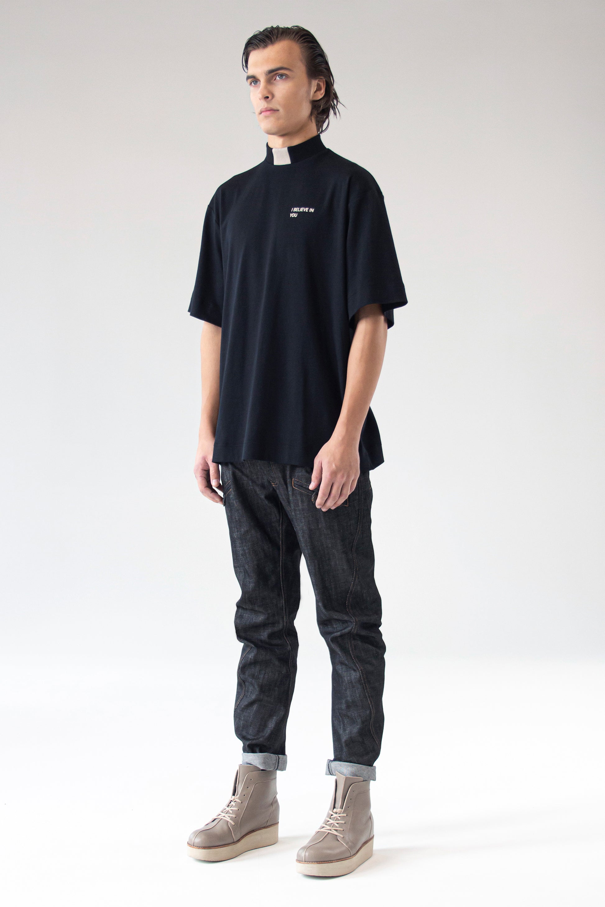 Loose fit, extended black jersey T-shirt with I BELIEVE IN YOU print on the front, stand-up collar with contrast beige detail on the front and zip at the back. Made from 100% certified high quality cotton.