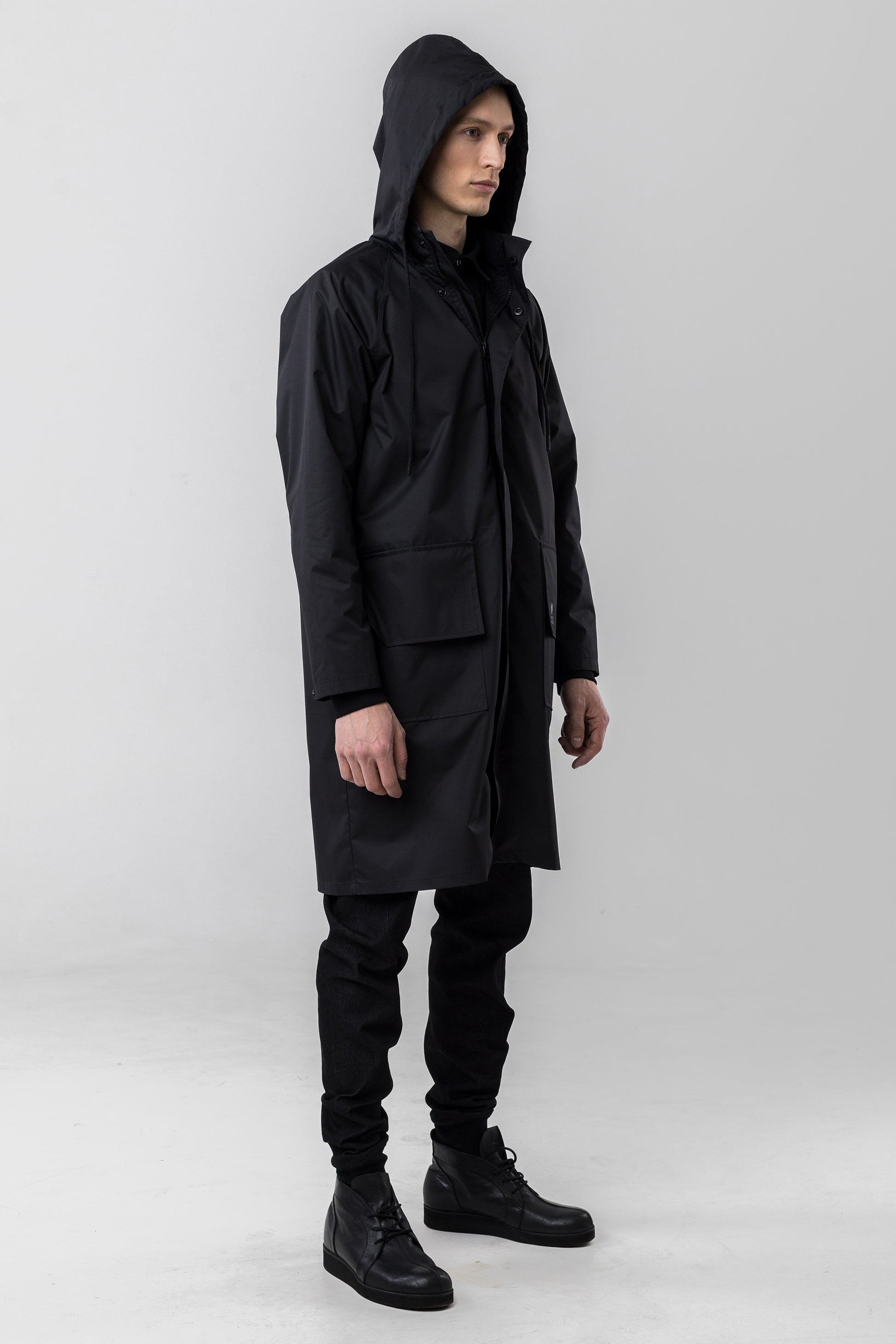 Regular fit unisex autumn raincoat. PU Coated, made from 100% Polyester. Zipper and two large pockets in front, large hood. Colour: black. Premium quality.
