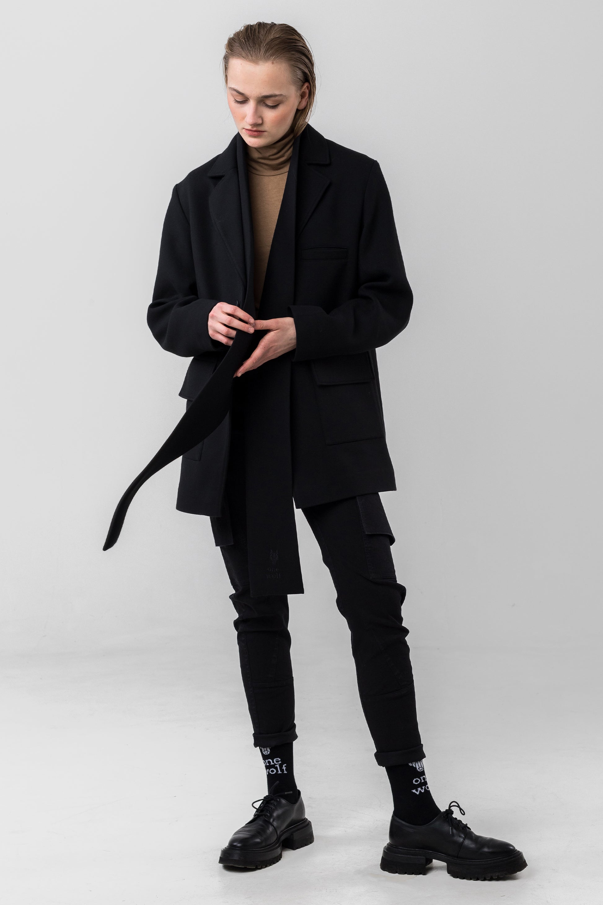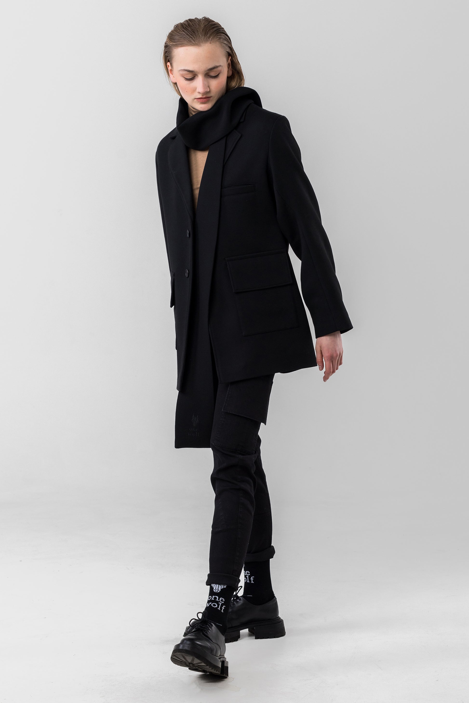 Straight cut, one size unisex scarf from 78% Polyester, 21% Rayon, 1% Spandex fabric. Small embroidered One Wolf logo. Colour: black. Premium quality. Made in Latvia.