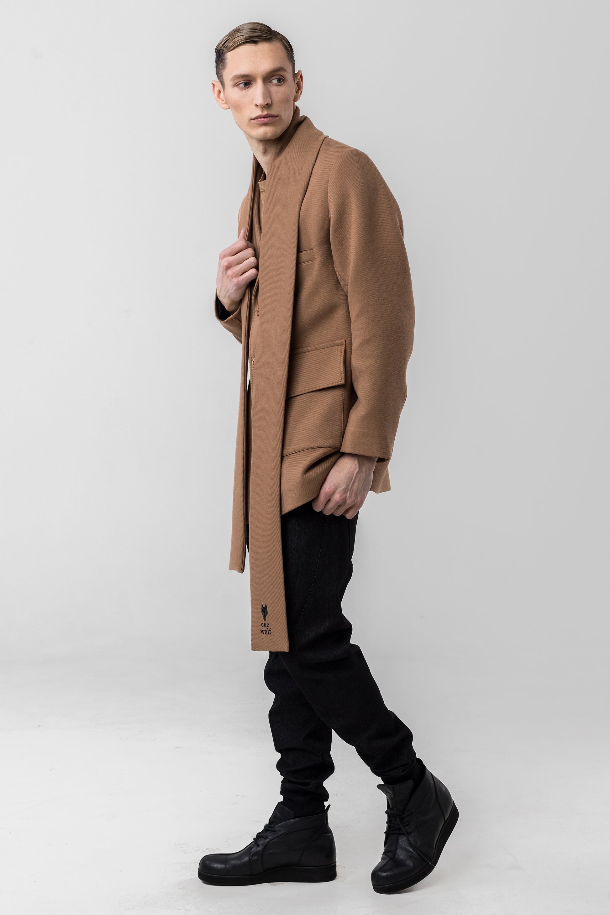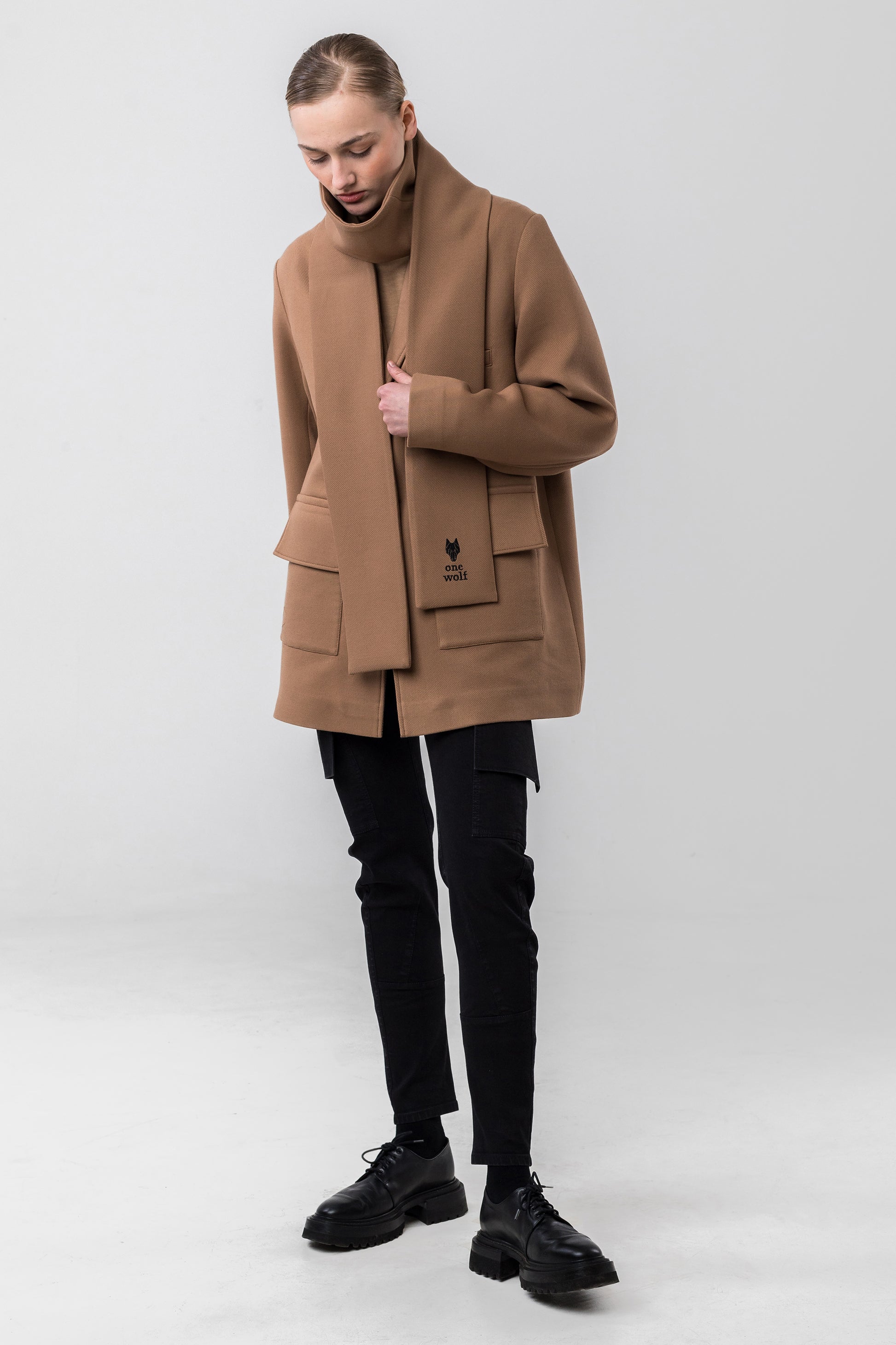 Straight cut, one size unisex scarf from 78% Polyester, 21% Rayon, 1% Spandex fabric. Small embroidered One Wolf logo. Colour: camel. Premium quality. Made in Latvia.