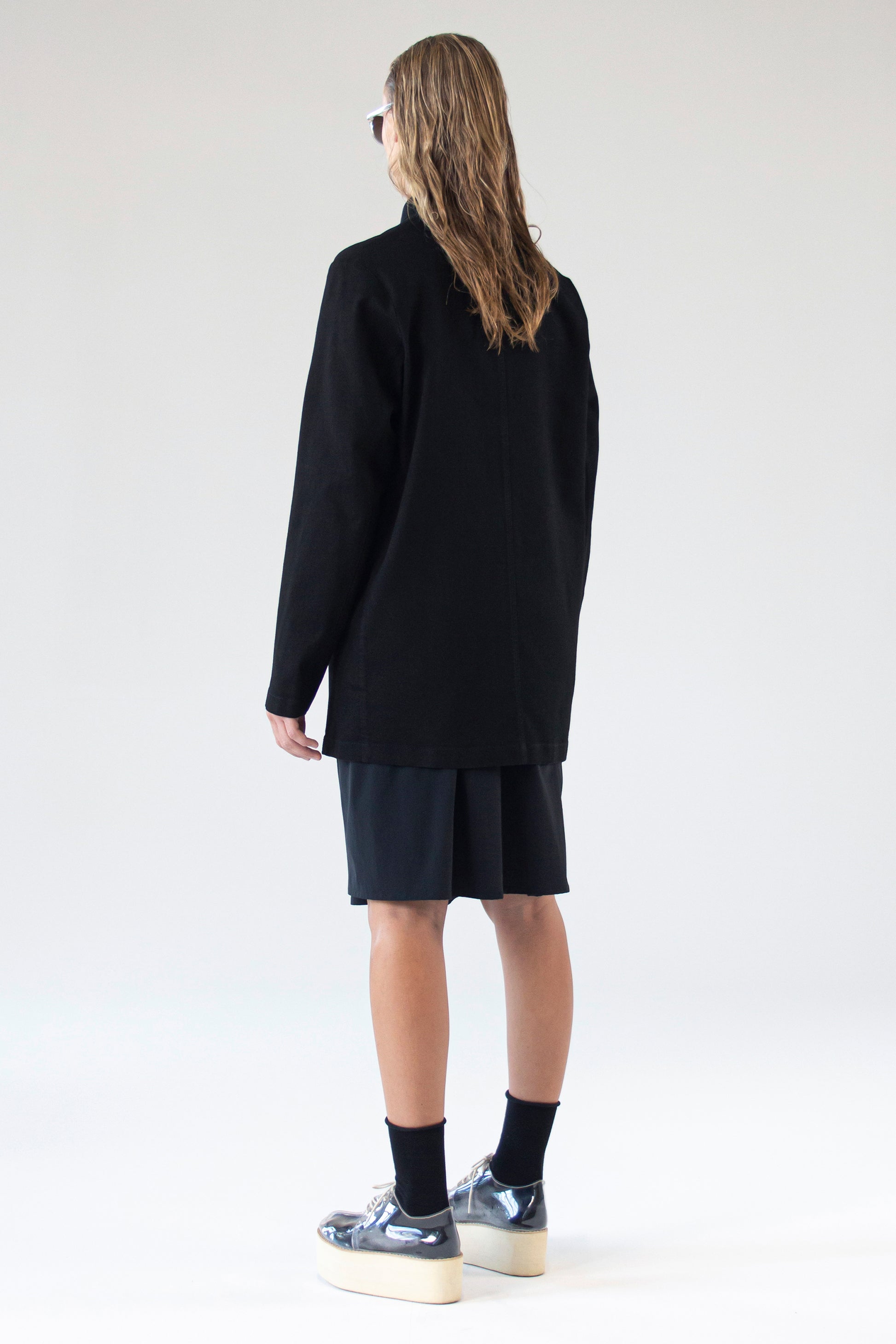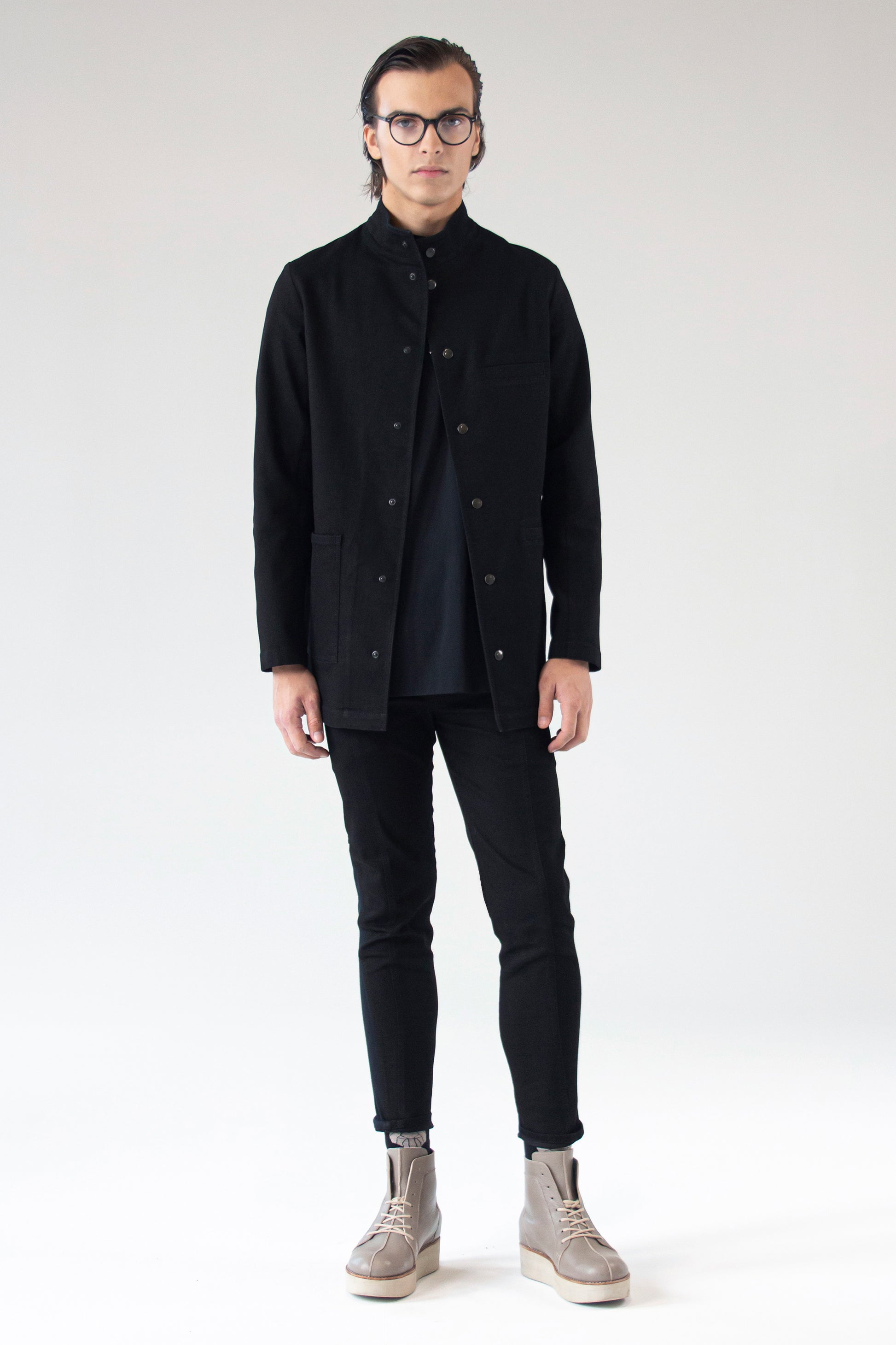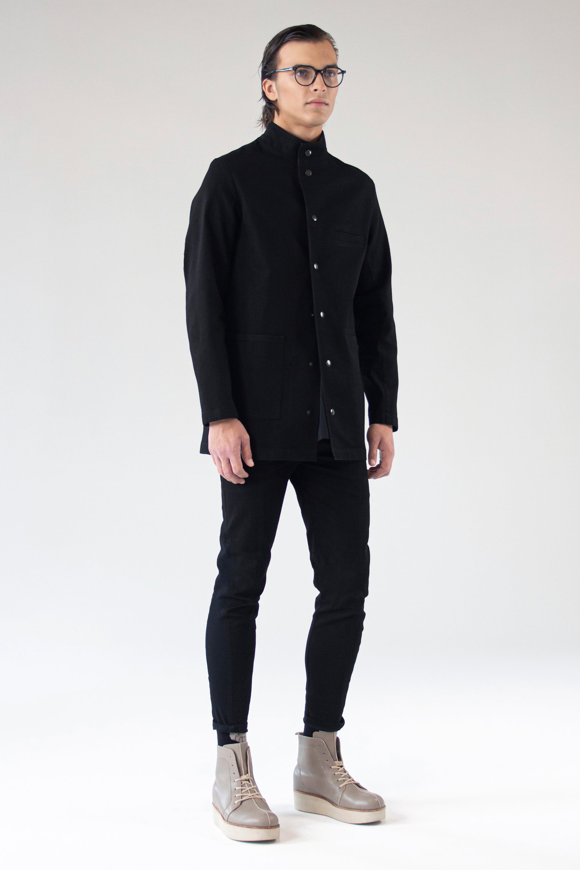 Regular fit, extended unisex denim jacket HOLY in a practical, slightly stretchy black denim fabric. The jacket has a stand-up collar, a minimalistic pocket and a button fastening. The denim fabric is cotton and slightly polyester and elastane to ensure a longer lasting denim jacket and a fresher look!